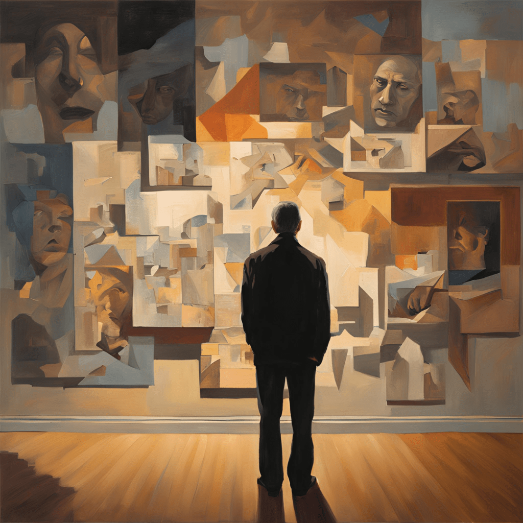 Men jag skulle vilja utmana dig att fundera på hur det skulle se ut om vår tidsuppfattning skulle vara cirkulär istället. Att allt det vi upplevt en gång finns framför oss. Vi har inte gått igenom det, vi har inte lämnat det bakom oss, vi har inte gått vidare utan allt det vi är finns framför oss. Som mannen på bilden (AI). Han står framför allt det här är just nu. Hela hans liv finns framför honom. Vissa minnen är små andra är större. Allt målar bilden av honom.