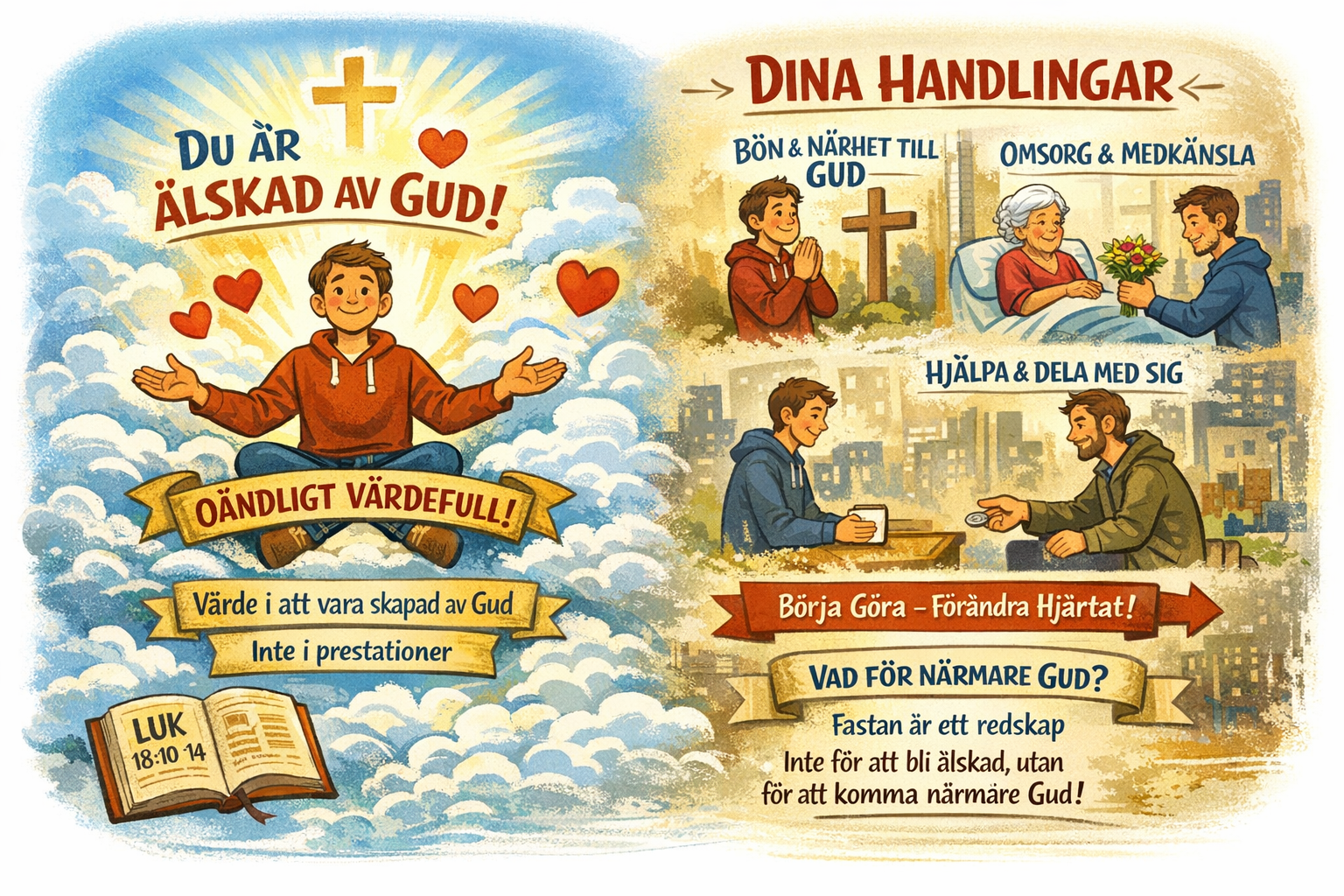 Jag är värdefull och älskad av Gud oavsett. Det finns inget jag kan göra för att bli mer älskad av honom eller mer värdefull. Mitt värde sitter inte i min förmåga att fasta, mina prestationer eller min känsla utan det sitter i att jag är skapad av Gud och därför oändligt värdefull. Gud skapar aldrig något meningslöst, jag är skapad ergo är jag meningsfull. Det måste vara min utgångspunkt.