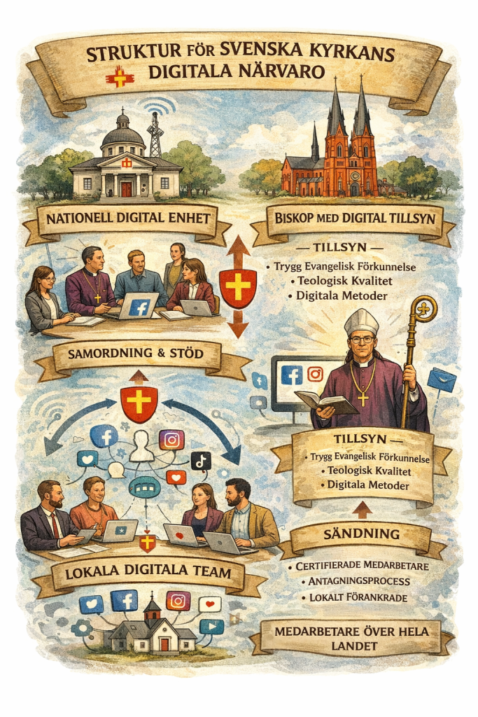 Kyrkomötet beslutar att ge en av våra biskopar ett särskilt uppdrag att utöva tillsyn över Svenska kyrkans digitala närvaro. Uppdraget är funktionellt och inte territoriellt. Tillsynen är kopplad till kyrkans liv och lära och gäller i alla digitala kanaler. På så sätt säkerställer man att evangeliet förkunnas rent och klart även digitalt.